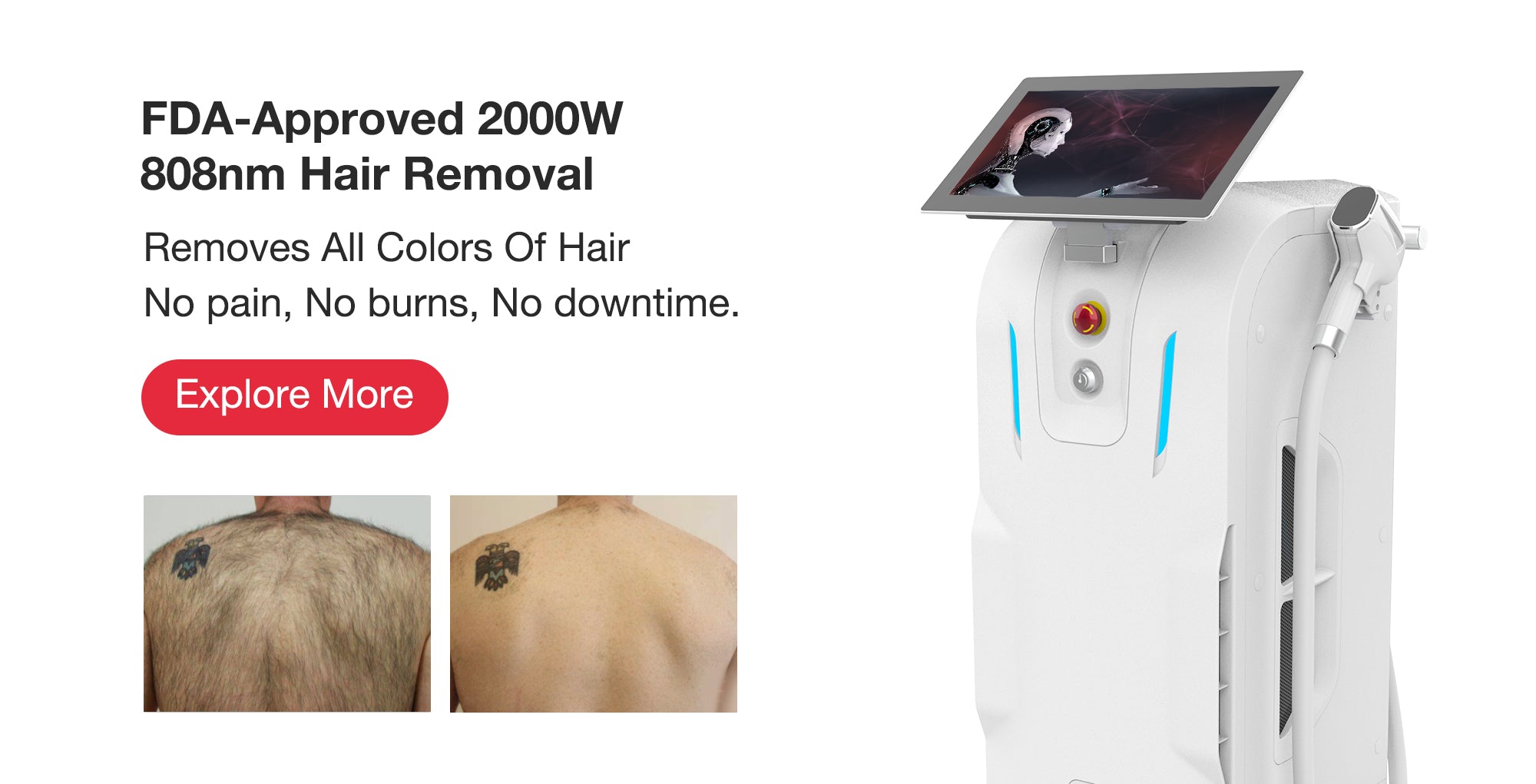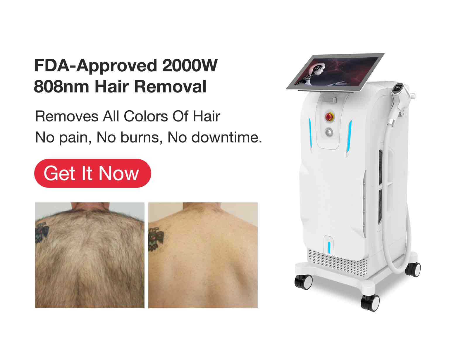 Multi-wavelength laser technology: The device is equipped with four wavelengths (755nm, 808nm, 940nm, 1064nm), which can target hair follicle tissues of different depths and structures, and adapt to various skin colors and hair types.